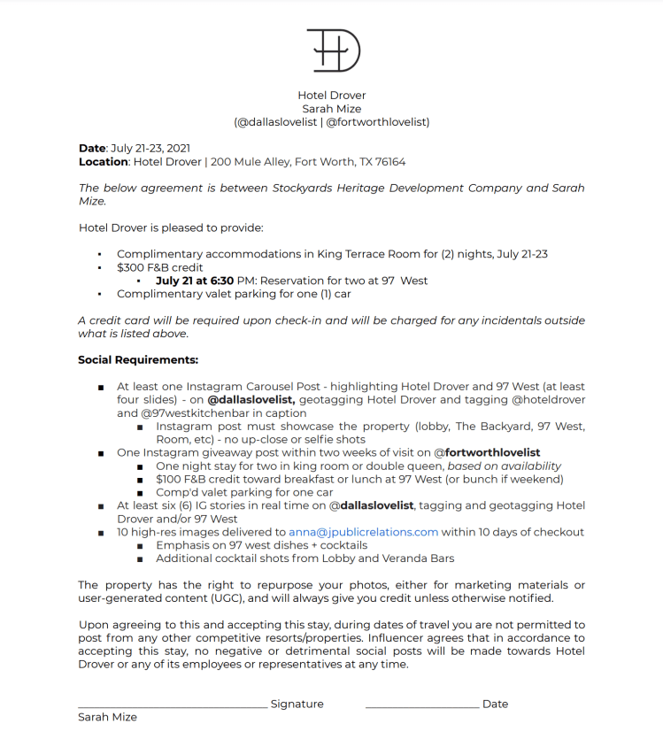 J/PR also gave me the opportunity to work with social media influencers. Most of the accounts I worked on at J/PR were luxury hotels, so influencer visits and stays were quite common. I learned a lot about what criteria my team looked at to determine which influencers to work with, and I also learned how to use Fohr to find influencers that would align well with our brands. I also wrote backgrounders on upcoming stays to give to hotel staff. These backgrounders gave basic information like who was coming and when, as well as information on what kind of brand these people built for themselves. These backgrounders enabled hotel staff to provide a more personalized experience for influencers that we hoped would lead to positive coverage. I also helped create some influencer contracts for upcoming stays. Writing these documents gave me a good sense of what social media coverage was worth to our clients.